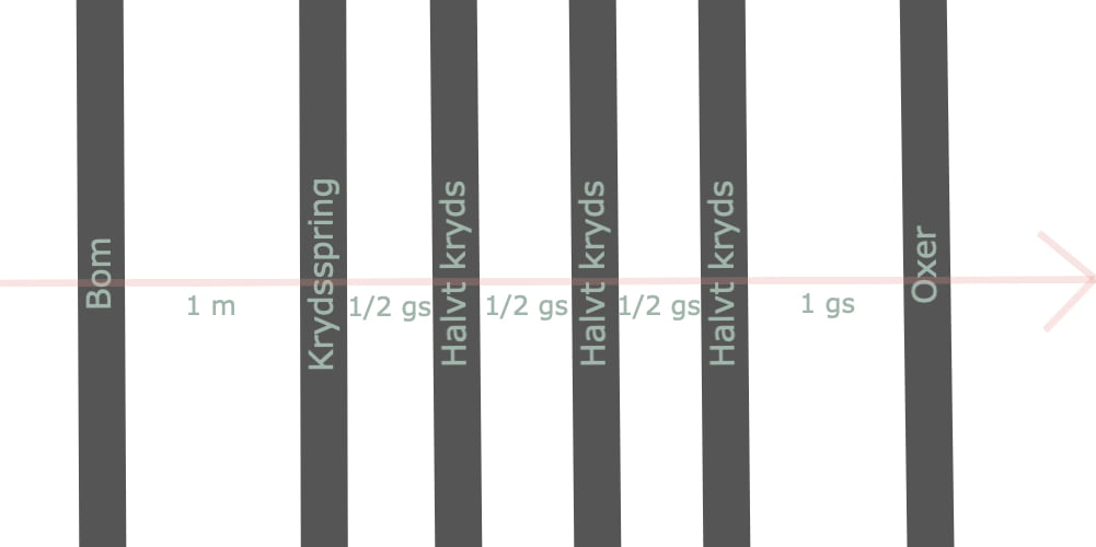 Vil du springe fejlfrit, er det også vigtigt, at din hest løfter begge ben ordentligt op over bommene – både bagbenene og forbenene. Derfor kan du vælge at sætte denne lidt mere krævende øvelsesbane op, som gør hesten opmærksom på, hvor højt den løfter det enkelte ben. Først lægges en bom ud, og derefter sættes et krydsspring op med 1 meters afstand til bommen. De tre efterfølgende spring skal være halvkryds med 1/2 galopspring hen til hver. Til sidst sætter du en oxer op 1 galopspring væk fra det sidste halvkryds. Det skulle gerne komme til at se sådan ud: