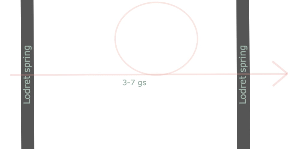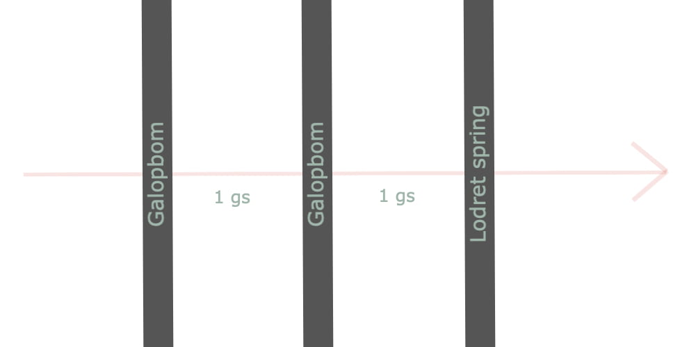 Når man træner hestens afsæt, har man det med at fokusere på bagbenene. Det er da også rigtigt, at hesten skal have bagparten godt ind under sig for at kunne sætte kraftigt af og derved komme højt op over springet. Men det er ikke altid nok. Man kan opleve, at hestens energi fortil dør ud lige idet, at den skal sætte af med forbenene – også selvom tilridningen ellers har været god og energifyldt. For at undgå det kan du lægge to galopbomme ud foran et spring. Der skal være et galopspring mellem hver, og de skal tilpasses nøjagtigt til størrelsen på den hest, du rider på. Bommene skal sørge for, at hestens forben aktiveres, så dens galopspring bliver mere kraftfulde. Springkombinationen, du skal lave, ser sådan ud: