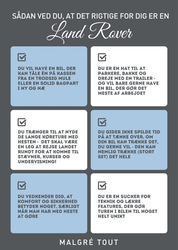 Eller rettere: Mon ikke jeg har udeladt noget, som måske kan være vigtigt for dig? Nu har jeg – en ganske almindelig hestepige – i hvert fald fremhævet det, som jeg synes gør en Land Rover Discovery Sport til den ultimative hestebil – også selvom den koster et par knaster. Vi bruger penge på så meget, når vi har hest, så hvorfor ikke også sørge for, at sikkerhed, komfort og køreglæde er i top, når vi farer frem og tilbage fra stalden, til stævne og til undervisning?