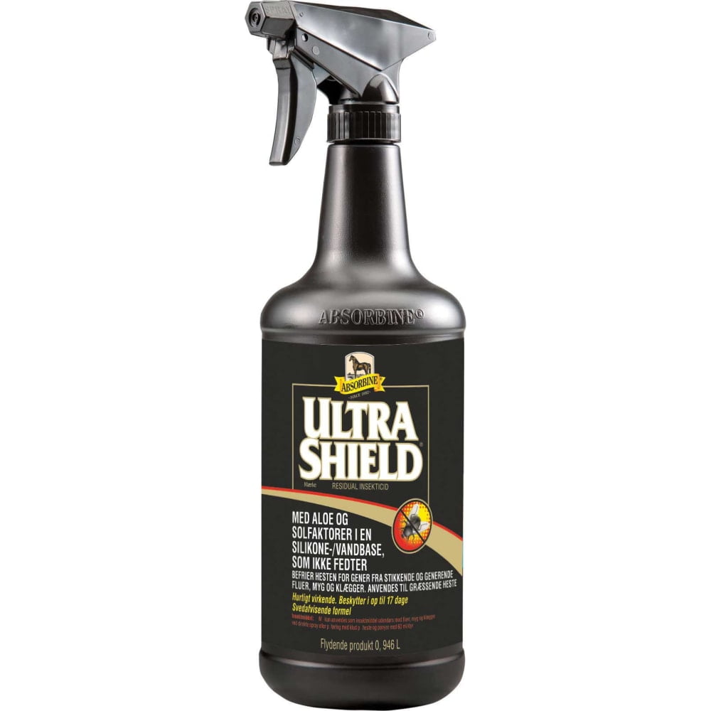 Absorbine Ultrashield Fluespray er en af de meste effektive fluesprays på markedet. Den beskytter hesten mod en masse insekter; fluer, myg, klæger, flåter, mitter og lus, og er derfor ideel til heste, der går ude og græsser. Sprayen holder i op til 17 dage og indeholder de aktive stoffer pyrethrin og permethrin. Den kan købes for 399,00 kr.