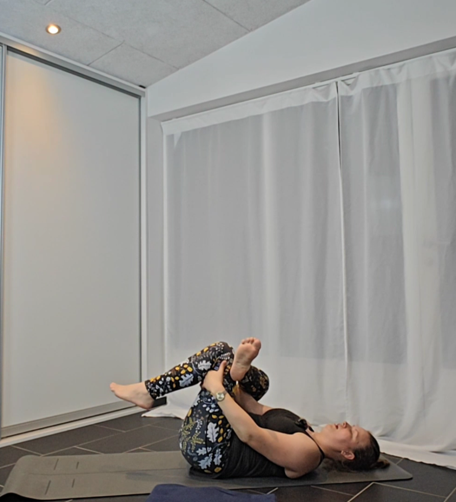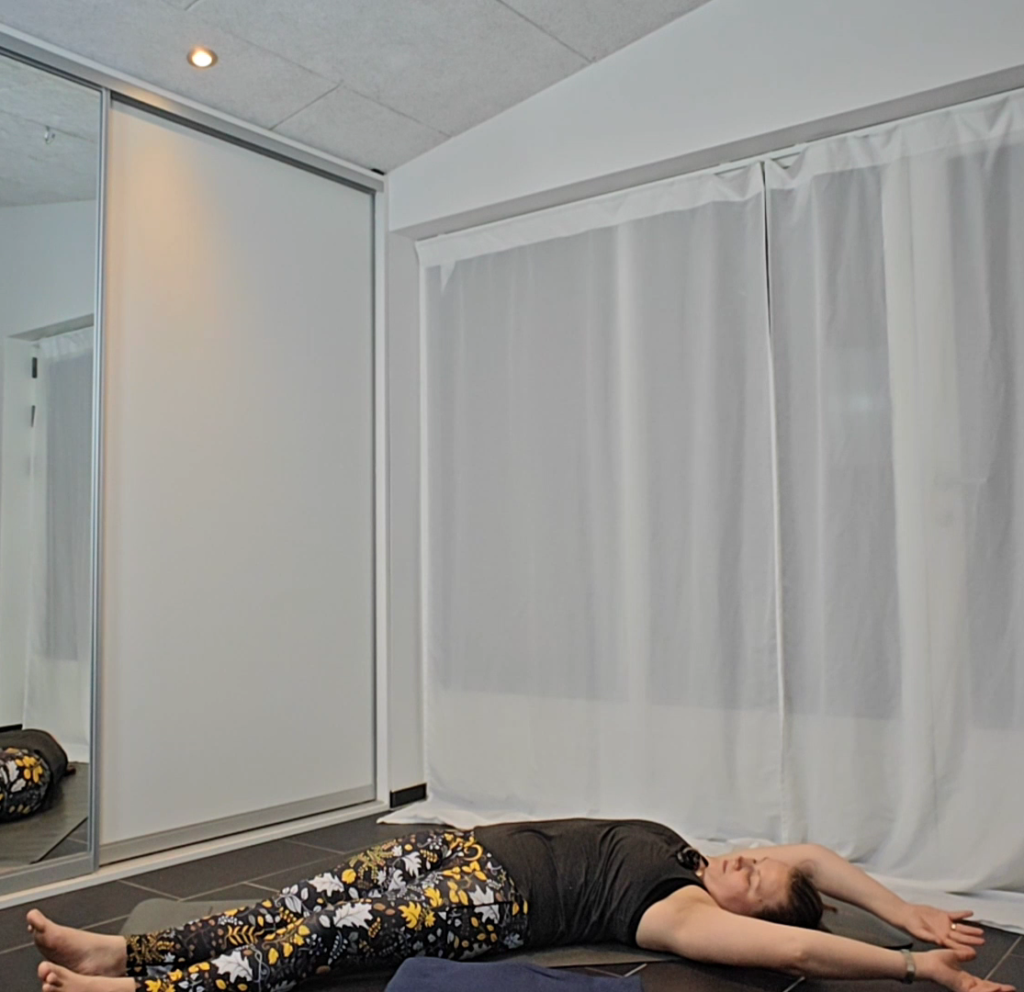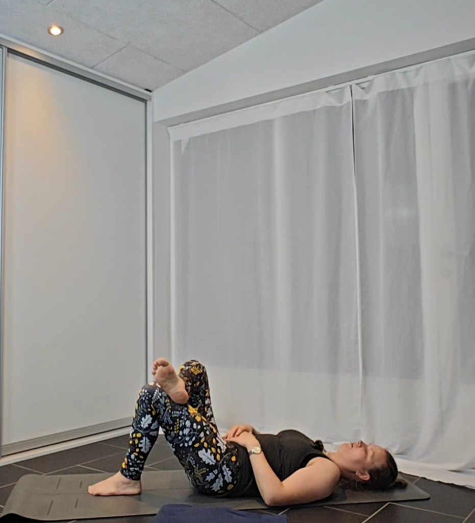 Lig fladt på ryggen. På en indånding fører du armene opover hovedet, på en udånding lader du armene søge langt til den ene side. Lad herefter fødderne gå til samme side som armene. Du kan gribe modsatte håndled og lade hælen søge over anklen. Stillingen giver længde, skaber bedre betingelser for dit åndedræt og afhjælper problemer som at knække sammen i sadlen.
