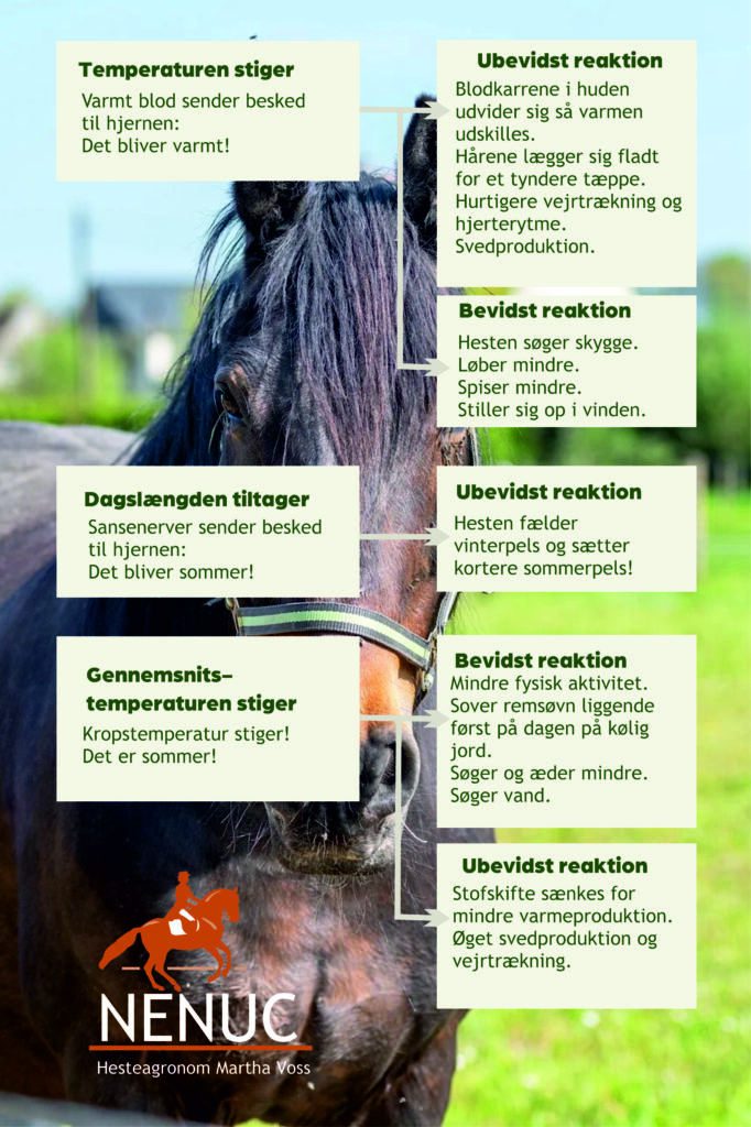 Et andet problem er imidlertid også, at med foråret og sommeren stiger lufttemperaturen, og en overvægtig hest kan have svært ved at regulere sin kropstemperatur. Normalt vil hestens nervesystem registrere, at hudtemperaturen stiger, og hjernen sender besked til hårene om at lægge sig, så pelsens isolerende lag bliver tyndere, ligesom blodkarrene i huden udvides, så hjertet kan sende mere blod til afkøling. Desuden kan hesten vælge at gå i skygge, drikke køligt vand og lignende.
