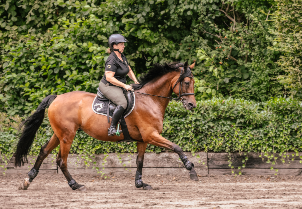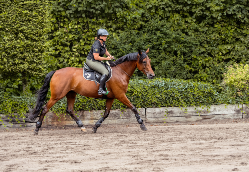 For at understrege vigtigheden af dit sæde og schenkel i denne øvelse rider Bianca Schoenmakers også uden bid. Hun er i stand til at samle og forkorte skridtlængden i galop.